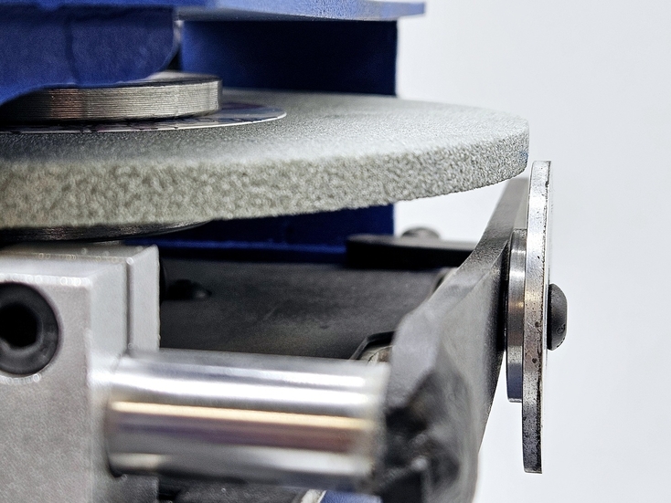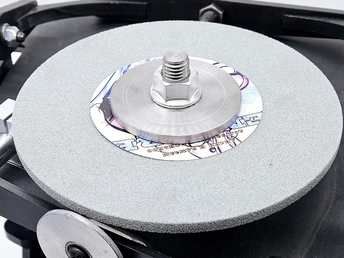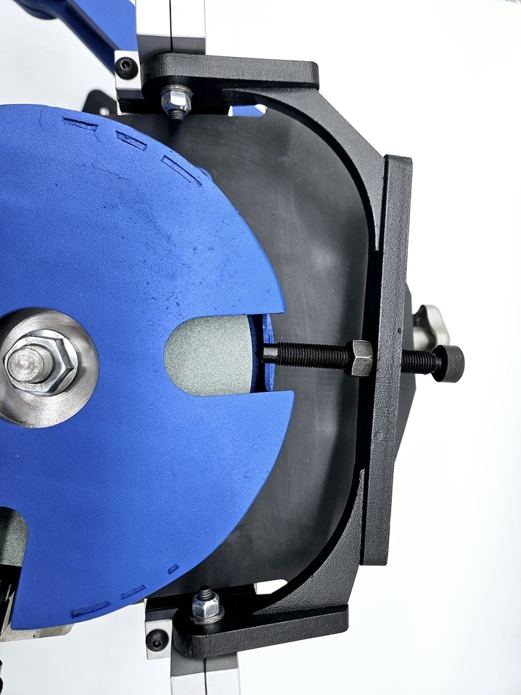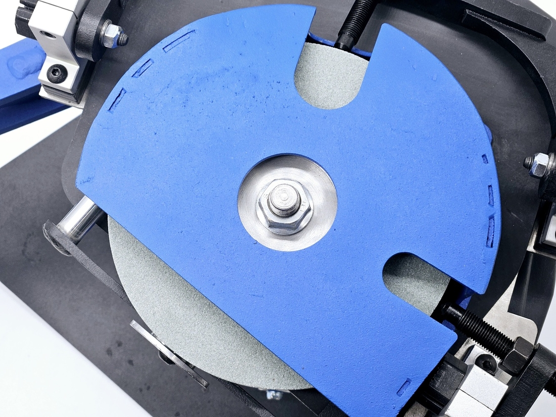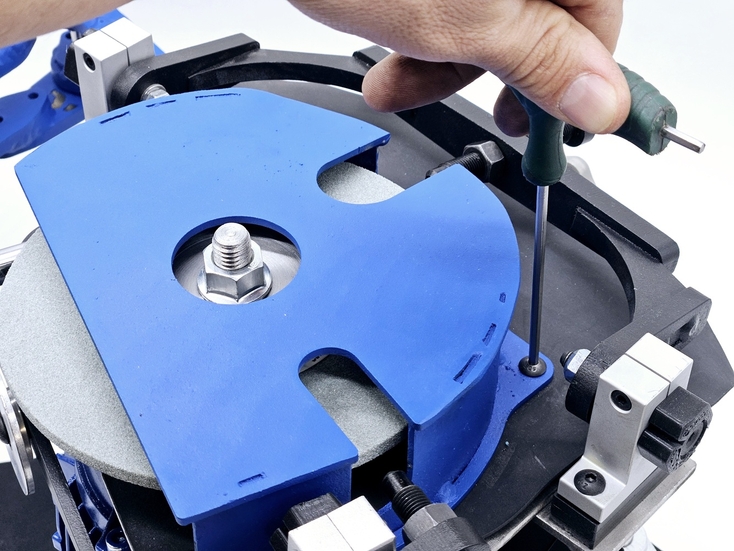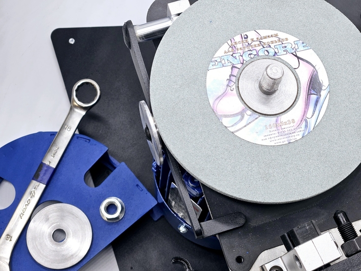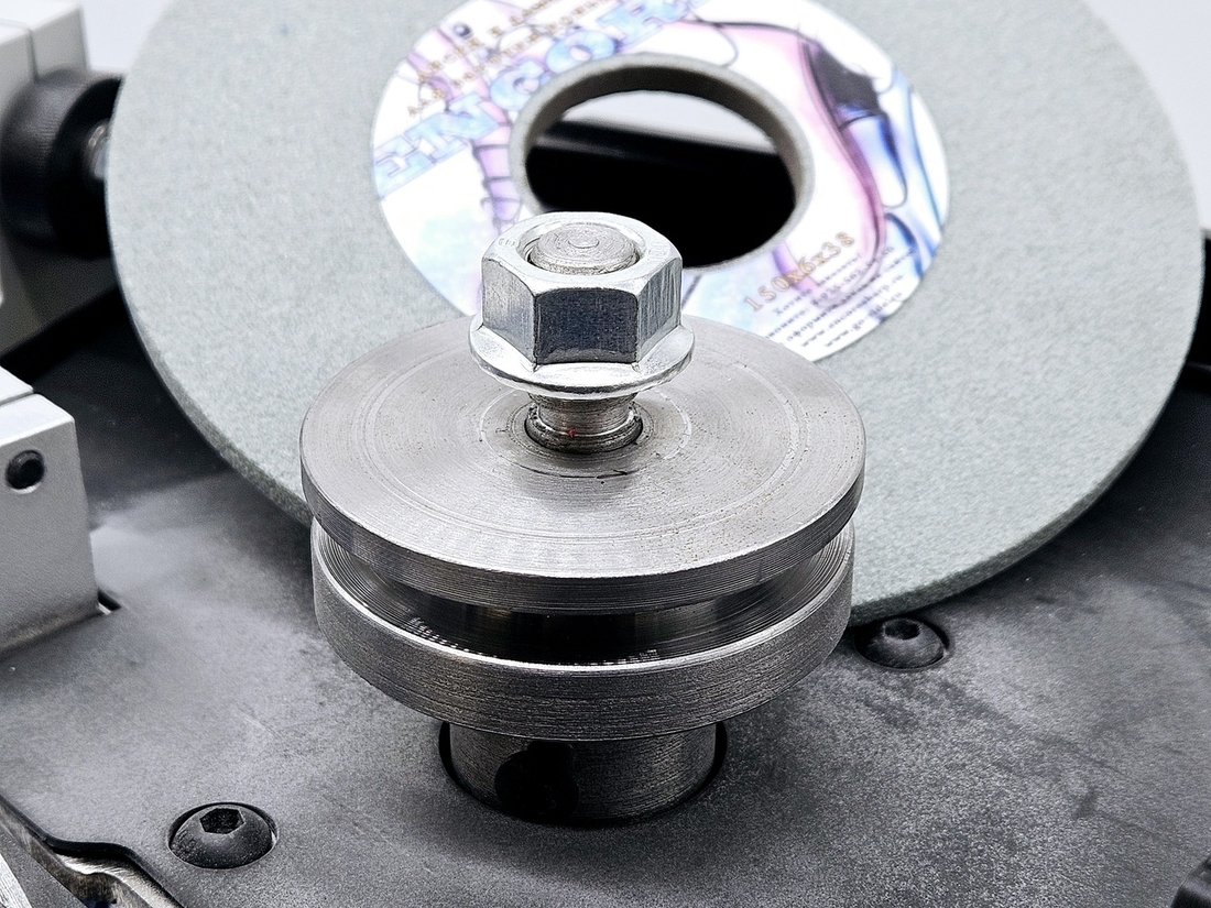 Калибровка выправки "Под желобок" осуществляется при помощи 2х специальных эксцентриковых втулок. При вращении этих втулок вокруг своей оси можно смещать ось скобы, на которой закреплен правящий алмазный карандаш, на 2 мм выше или ниже. При правильной настройке вершина закругления, которое получается в результате предания заточному диску выпуклой формы, должна быть ровно посередине торца заточного диска.