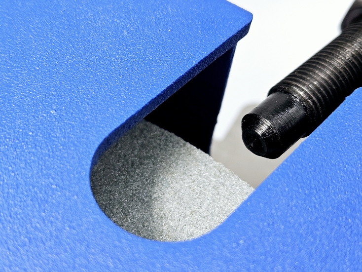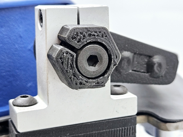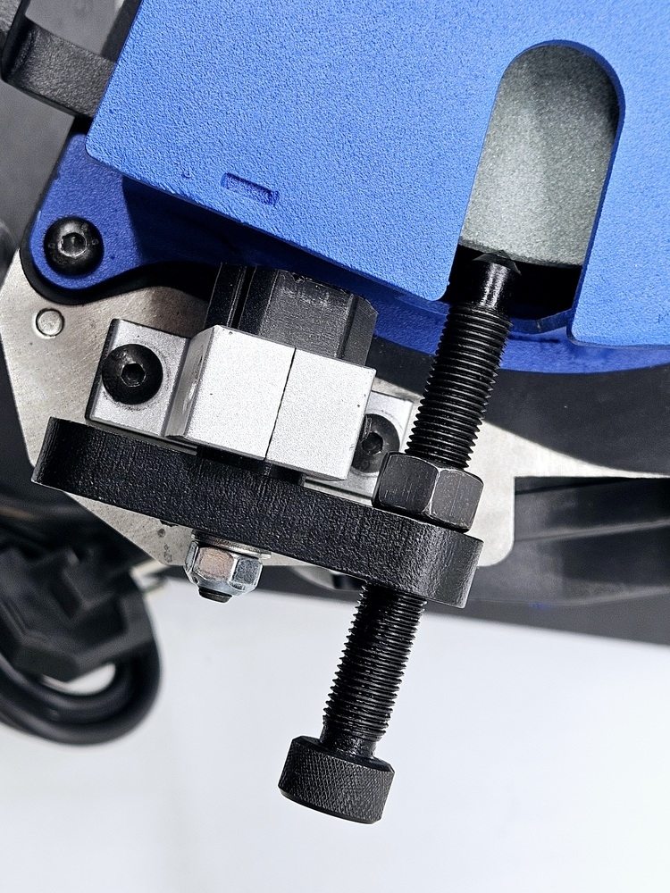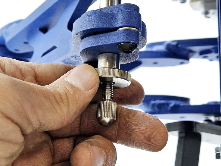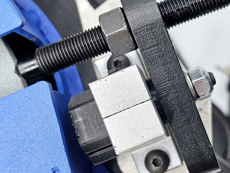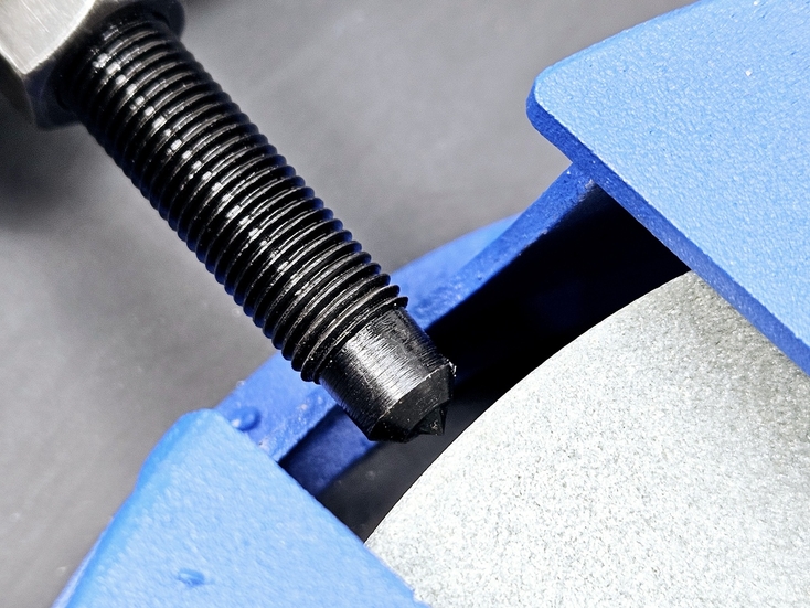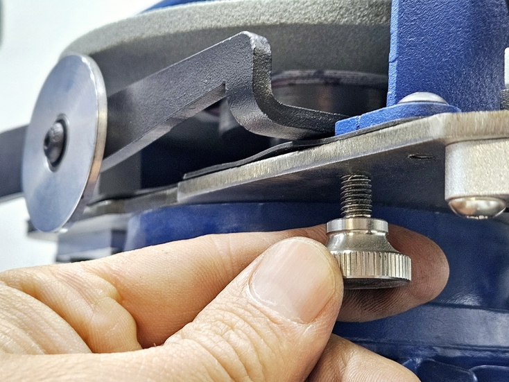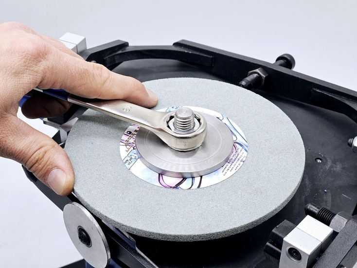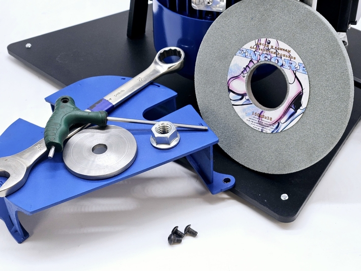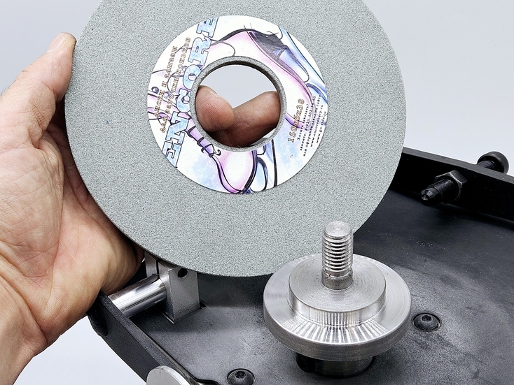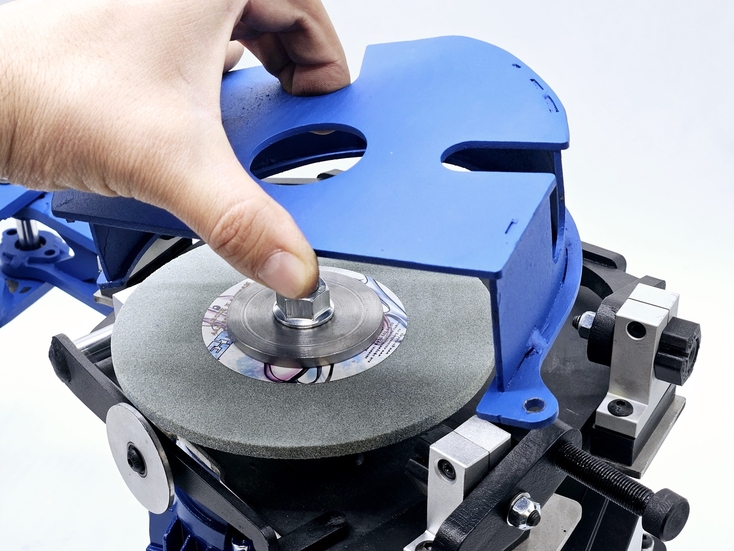 Калибровка выправки "Под желобок" осуществляется при помощи 2х специальных эксцентриковых втулок. При вращении этих втулок вокруг своей оси можно смещать ось скобы, на которой закреплен правящий алмазный карандаш, на 2 мм выше или ниже. При правильной настройке вершина закругления, которое получается в результате предания заточному диску выпуклой формы, должна быть ровно посередине торца заточного диска.