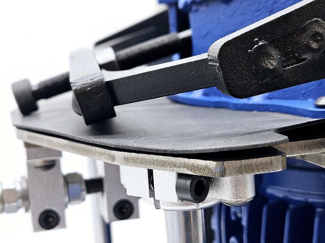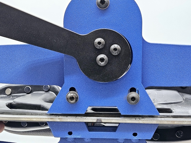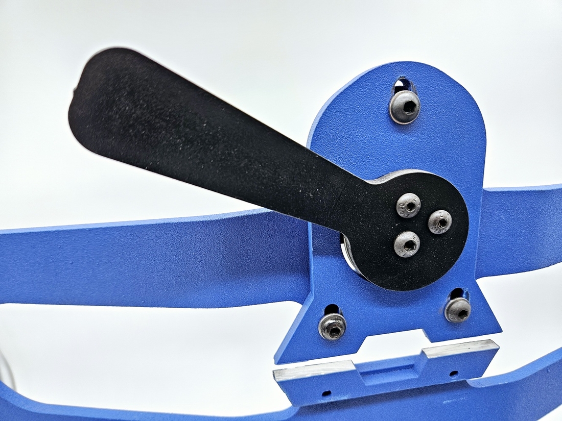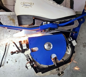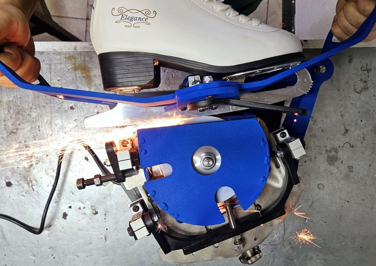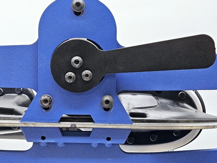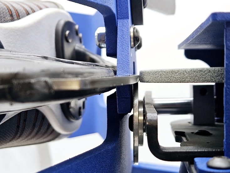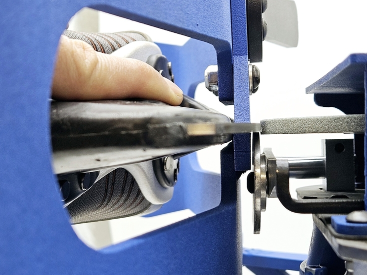 Для определения правильности настройки станка отторцуйте диск "под желобок", произвольного радиуса, зажмите конек в держатель мыском влево, включите станок и коротко дотронтесь лезвием до заточного диска без проводки. Затем вытащите конек, и снова зажмите его другой стороной, мысокм вправо, и снова так же дотронтесь лезвием до заточного диска. По оставленным заточным диском на лезвии конька срезам можно определить, правильно ли настроен станок. Для идеальной работы станок должен быть настроен таким образом, чтобы линии среза были параллельны друг другу как показано на рисунке ниже. Если это не так, станок необходимо откалибровать. Для этого ослабьте винты держателей эксцентриковых втулок и понемногу меняйте положение втулок, проворачивая втулки вокруг своей оси а затем снова делайте тестовые касания и проверяйте линии среза на лезвии конька. Необходимо поймать такое положение втулок, при котором линии среза будут параллельными. Данную процедуру необходимо проделать всего 1 раз для первоначальной настройки выправки станка под желобок.