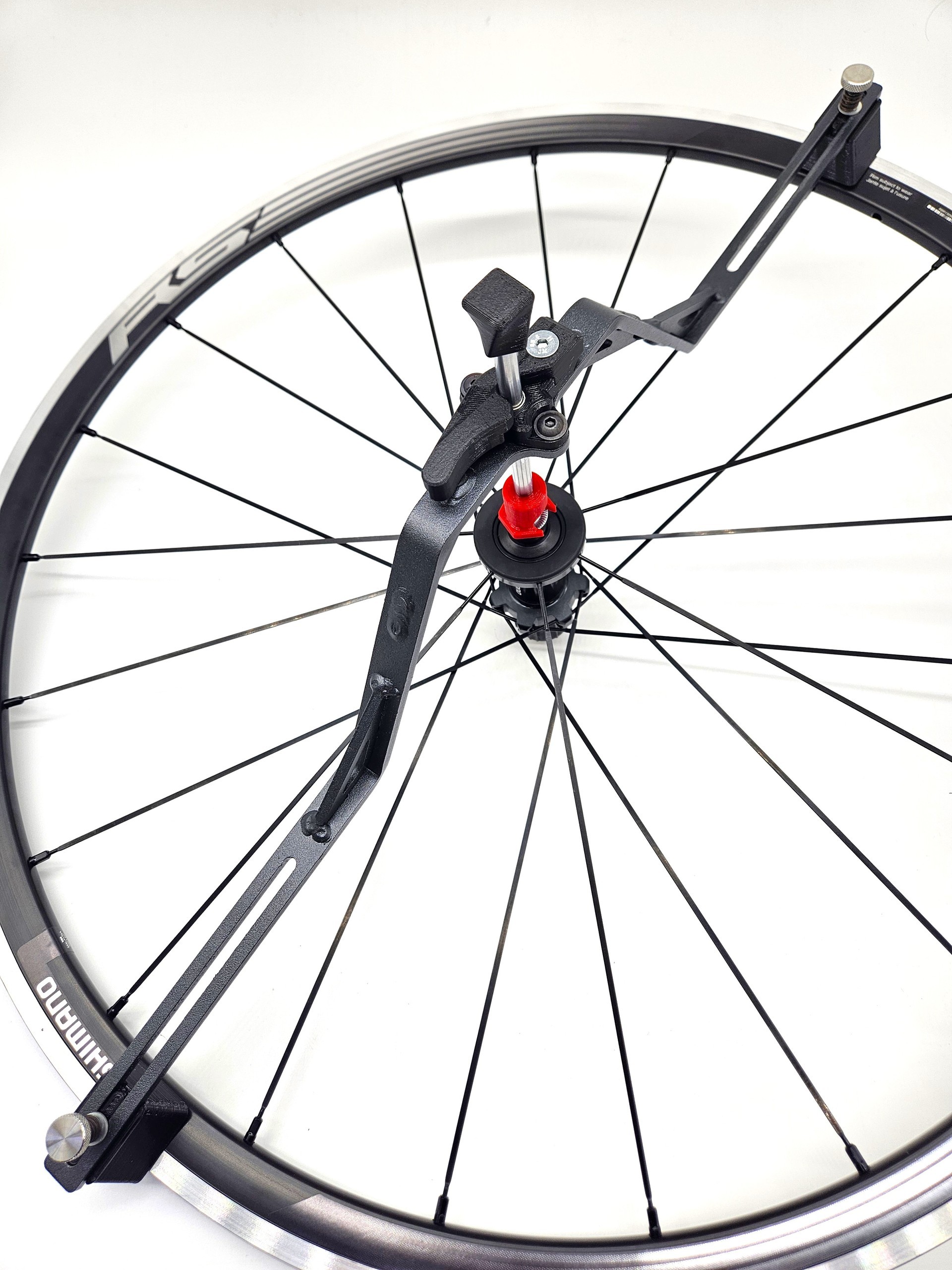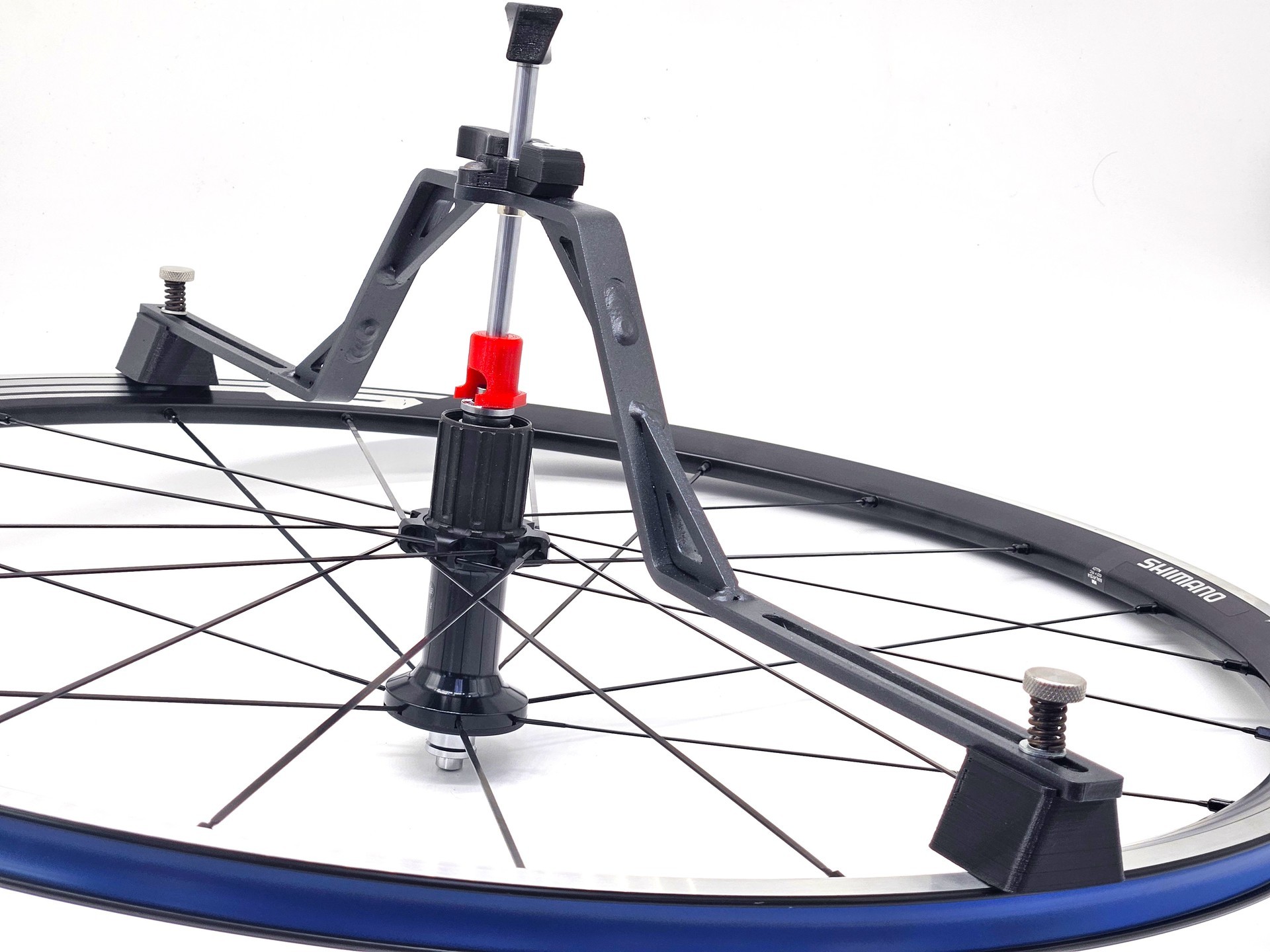 Устойчиво стоит на столе, влазят любые по размеру колеса не снимая покрышек. Даже самые широкие втулки и самые широкие покрышки без проблем зажимаются. Удобные индикаторы, не нужен зонтомер.